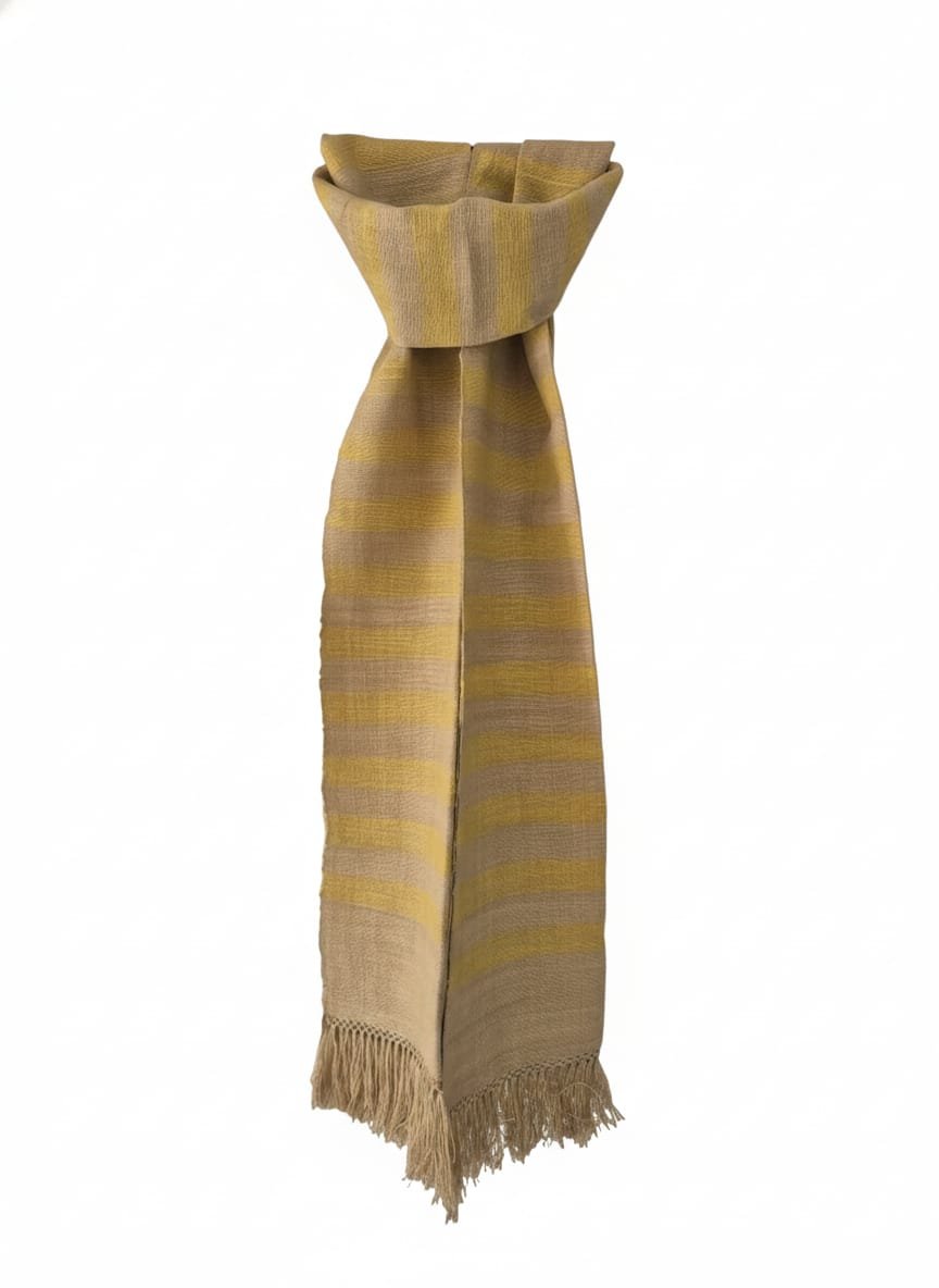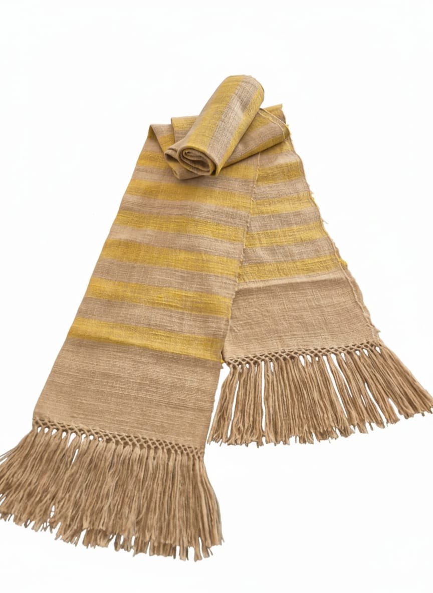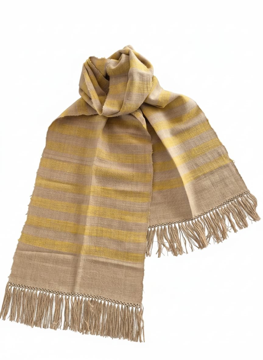 Eri Silk Muffler in light brown with full length yellow stripe: