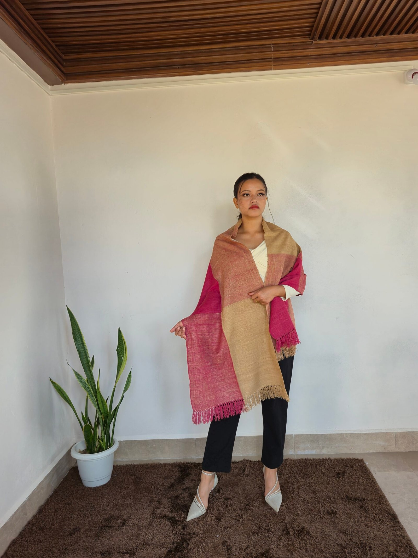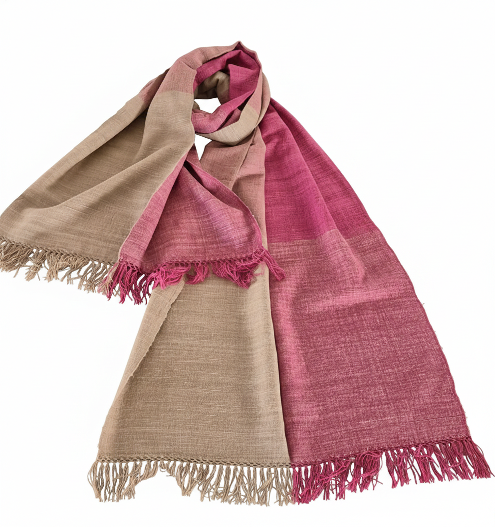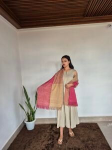 An Eri silk stole in light brown with burgundy color is a vibrant and eye-catching accessory. Eri silk, known for its soft texture and durability, is often handwoven by skilled artisans, making each piece unique.