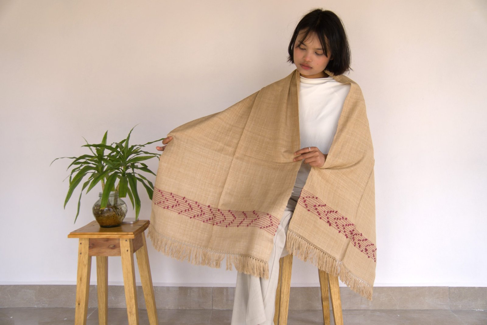 The Eri Silk Stole in light brown with a maroon dart design is a beautifully handcrafted accessory made from Eri silk, also known as "Ahimsa silk" due to its ethical and sustainable production process. This stole is known for its soft texture, durability, and eco-friendly nature.Key Features: