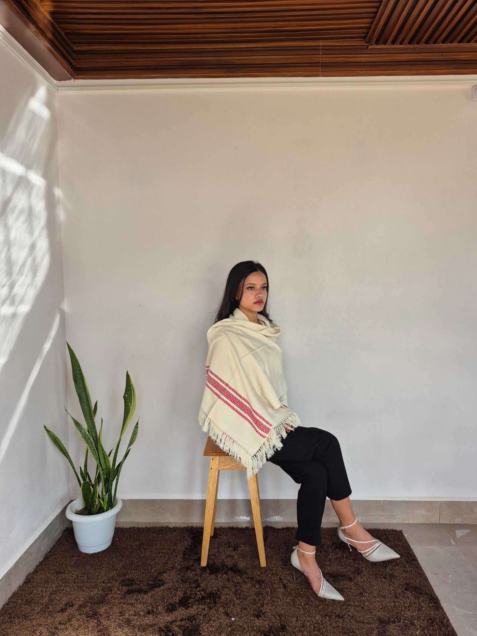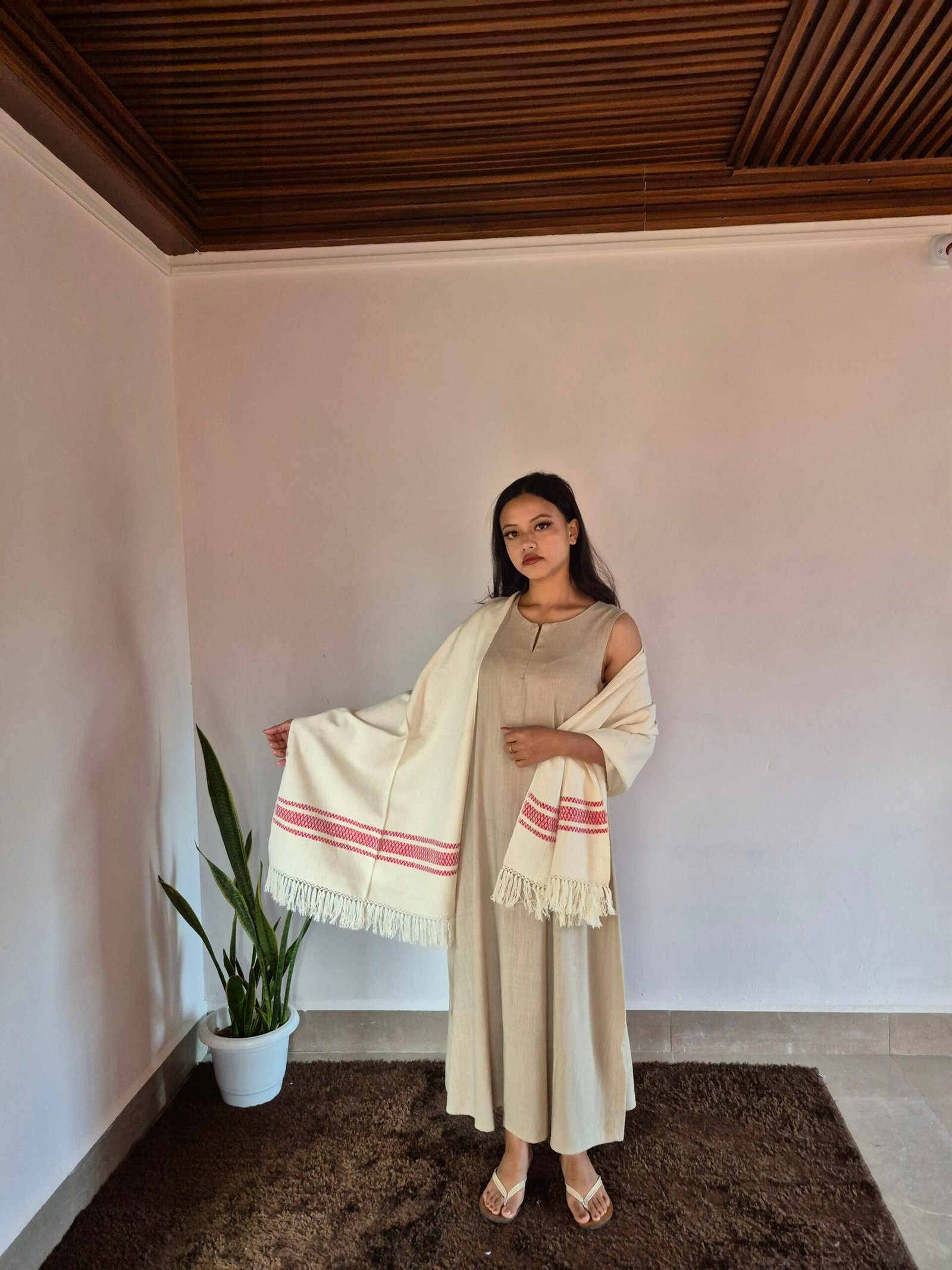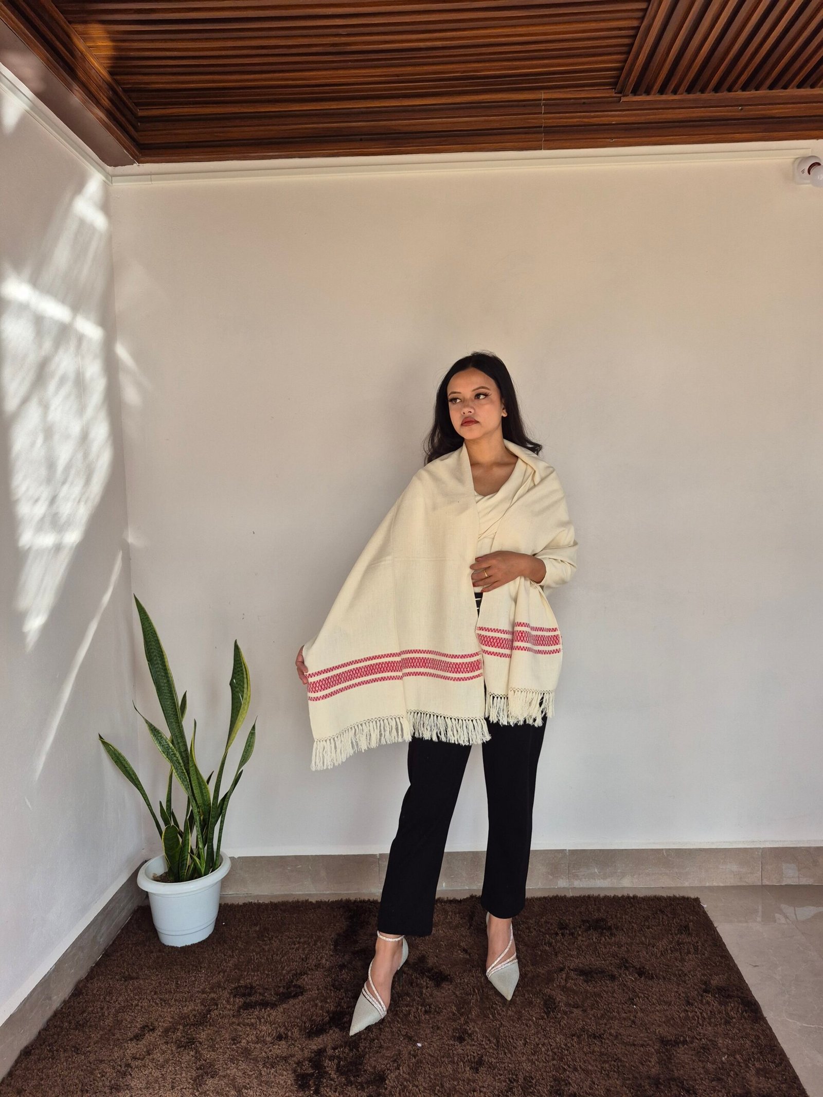 The Eri Silk Stole in white with a red border design is a beautifully handcrafted accessory made from Eri silk, also known as "Ahimsa silk" due to its ethical and sustainable production process. This stole is known for its soft texture, durability, and eco-friendly nature.Key Features: